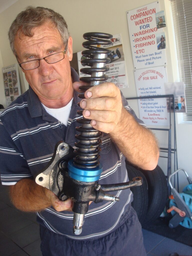 Excessive play in the Cam and Peg steering box could not be resolved as the box or parts were no longer available and could also not satisfactorily be adjusted. In addition the steering was very heavy to turn!! This forced me into another search outside of South Africa. The first break through was finding a roller bearing kit which replaced the damper blades (Springs 2 inch shorter were also fitted.) The advantage was a lighter steering and with the bearings fitted, the messy lubrication system was no longer required. The search continued and I managed to locate a second hand Morgan rack and pinion steering which meant that I could discard the worn-out steering box. While going to work on the front suspension it was decided to also replace the kingpins with new hard chrome kingpins and bronze bushes .All the parts and fitting instructions were obtained from MULFAB, a company located in the UK. The owner Peter Mulburry was most helpful throughout the whole process of installing the parts.
